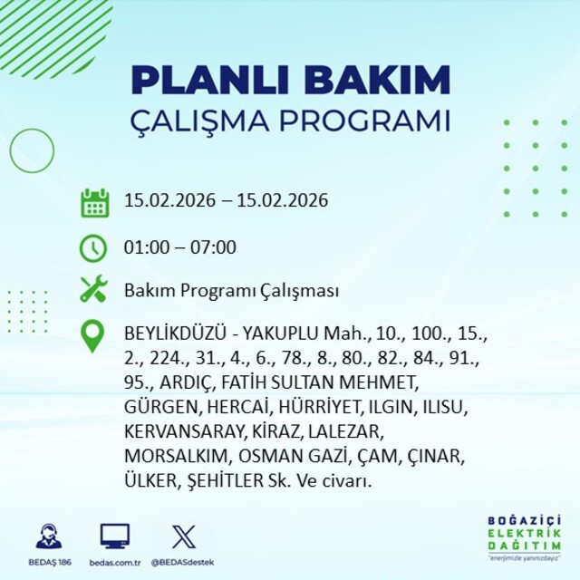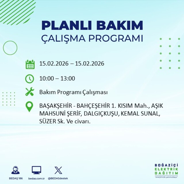 İstanbul'da 15 Şubat Pazar günü 10 ilçede elektrik kesintisi uygulanacak. Şebeke yenileme ve arıza önleme amaçlı yapılan bakım çalışmaları kapsamında belirlenen bölgelerde saatlik enerji kesintileri yaşanacak. BEDAŞ, tarafından yapılan açıklama sonucunda, "Elektrik ne zaman gelecek?" sorusu da yanıtı yanıt buldu. İşte 15 Şubat Pazar elektrik kesintisi yaşanacak ilçeler...