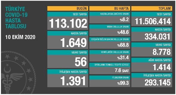 Sağlık Bakanı Fahrettin Koca Twitter üzerinden son dakika olarak corona virüs vaka sayısı ve vefat edenlerin sayısı açıklıyor. 10 Ekim vaka sayısı 1.649, hayatını kaybedenlerin sayısı ise 56 olarak açıklandı. 11 Ekom koronavirüs tablosu merak ediliyor. İşte son açıklanana veriler...