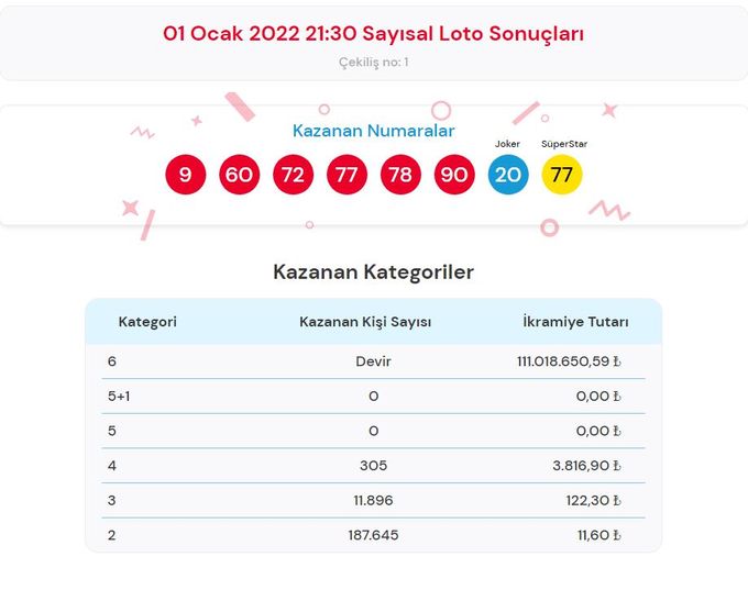 ÇILGIN SAYISAL LOTO SONUÇLARI 1 OCAK 2022: 9, 60, 72, 77, 78, 90, JOKER 20, SÜPERSTAR 77
