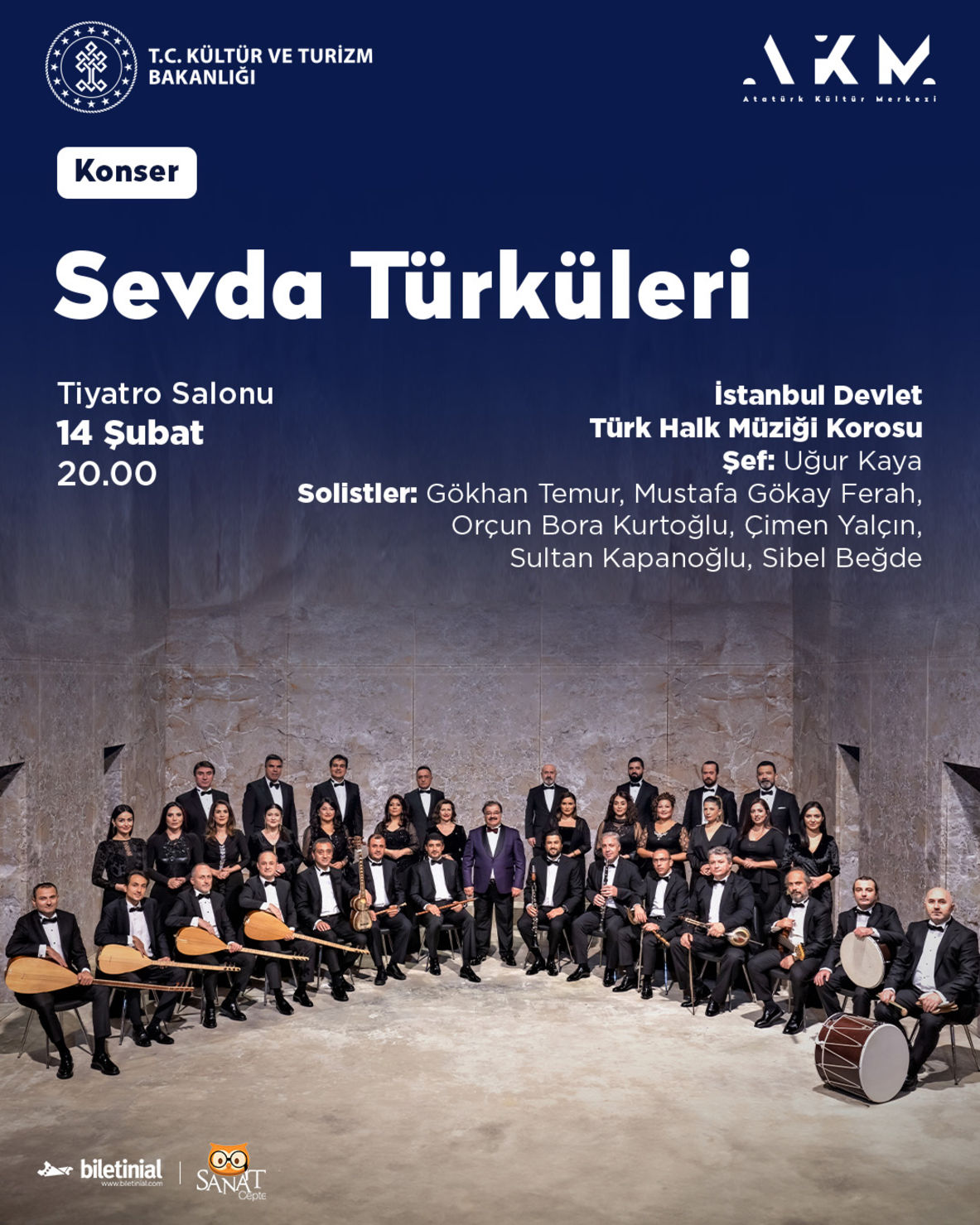 İstanbul Devlet Türk Halk Müziği Korosu tarafından Sevgililer Gününe özel sevda ve aşka dair türküler konseri, 14 Şubat Çarşamba günü saat 20.00’de AKM Tiyatro Salonunda müzikseverlerle buluşuyor. Şef Uğur Kaya yönetimindeki konserde Gökhan Temur, Mustafa Gökay Ferah, Orçun Bora Kurtoğlu, Çimen Yalçın, Sultan Kapanoğlu, Sibel Beğde yer alacak.
