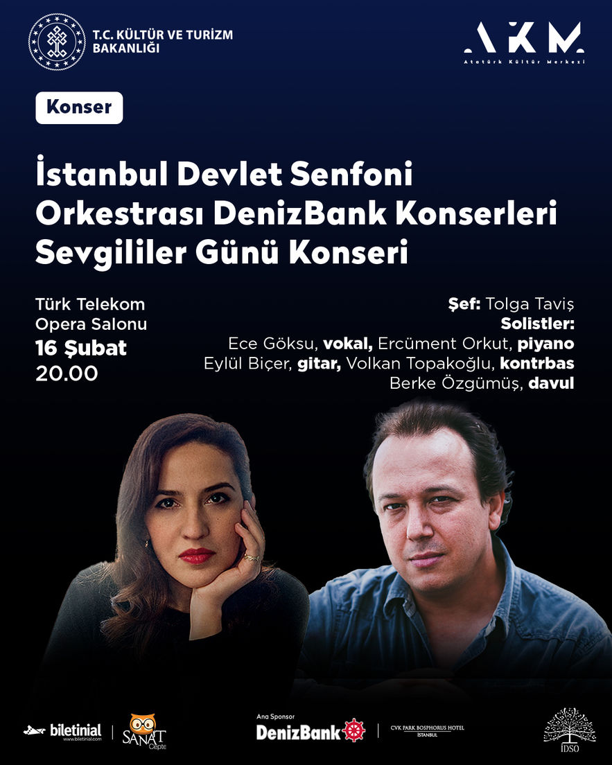 Şef Tolga Taviş yönetimindeki İstanbul Devlet Senfoni Orkestrası, 16 Şubat’ta Türk Telekom Opera Salonunda gerçekleşecek Sevgililer Günü konserinde, Frank Sinatra’dan George Gershwin’e, Sergio Mendes’ten Duke Ellington’a birçok sanatçının aşka adanmış unutulmaz eserlerini seslendirecek. Eserler, çok sesli düzenlemeleriyle Ece Göksu (vokal & piyano), Eylül Biçer (gitar), Volkan Topakoğlu (kontrbas), Berke Özgümüş (davul) ve Ercüment Orkut’un (piyano) tarafından yorumlanacak.