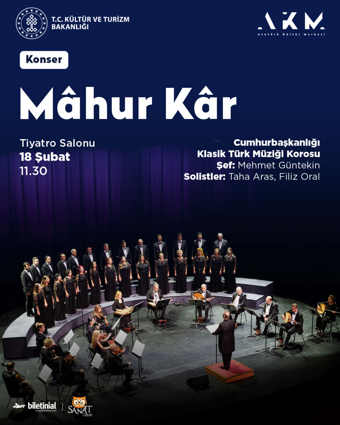 Cumhurbaşkanlığı Klasik Türk Müziği Korosunun 18 Şubat 2024 Pazar günü saat 11.30’da AKM Tiyatro Salonunda gerçekleştireceği konserin ilk bölümünde, 14’üncü yüzyılda Abdülkadir Meragî tarafından bestelenmiş ‘Mâhur Kâr’ı ve klasik dönemin büyük bestekârları Kırım Hanı Gazi Giray, Eyyubî Ebubekir Ağa, İsmail Dede Efendi ve Dellâlzade İsmail Efendi tarafından bestelenmiş seçkin eserler seslendirilecek. İkinci bölümde konserin ilk solisti Taha Aras, neoklasik dönem bestekârları Mustafa Sunar, Rahmi Bey ve Vali Ahmet Mithat Bey’in Kürdîlihicazkâr eserlerini seslendirecek. Solist Filiz Oral ise Şekerci Cemil Bey, Udî Hrant ve Şemseddin Ziya Bey’in Hicaz makamından neoklasik dönem eserleriyle dinleyici huzuruna çıkacak. Mehmet Güntekin’in yönetimindeki konser, koronun seslendireceği Hüseynî eserlerle son bulacak.