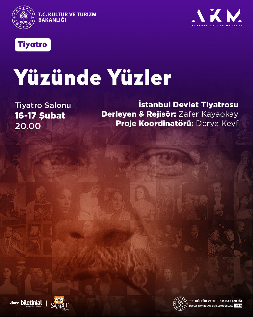 İstanbul Devlet Tiyatrosunun sahneye koyduğu ‘Yüzünde Yüzler’ oyunu, 16-17 Şubat 2024 günleri saat 20.00'de Atatürk Kültür Merkezi Tiyatro Salonunda seyircisiyle buluşacak. Gazi Mustafa Kemal Atatürk liderliğinde bir ulusun; milli mücadele, TBMM'nin kuruluşu, vatanın kurtuluşu ve Cumhuriyetin ilan edilmesiyle taçlanan yüzyıllık tarihsel kesiti sahneye taşınacak. İstanbul Devlet Tiyatrosu sanatçılarından oluşan yaklaşık 120 kişilik bir kadronun görev aldığı ‘Yüzünde Yüzler’in rejisi Zafer Kayaokay’a ait.