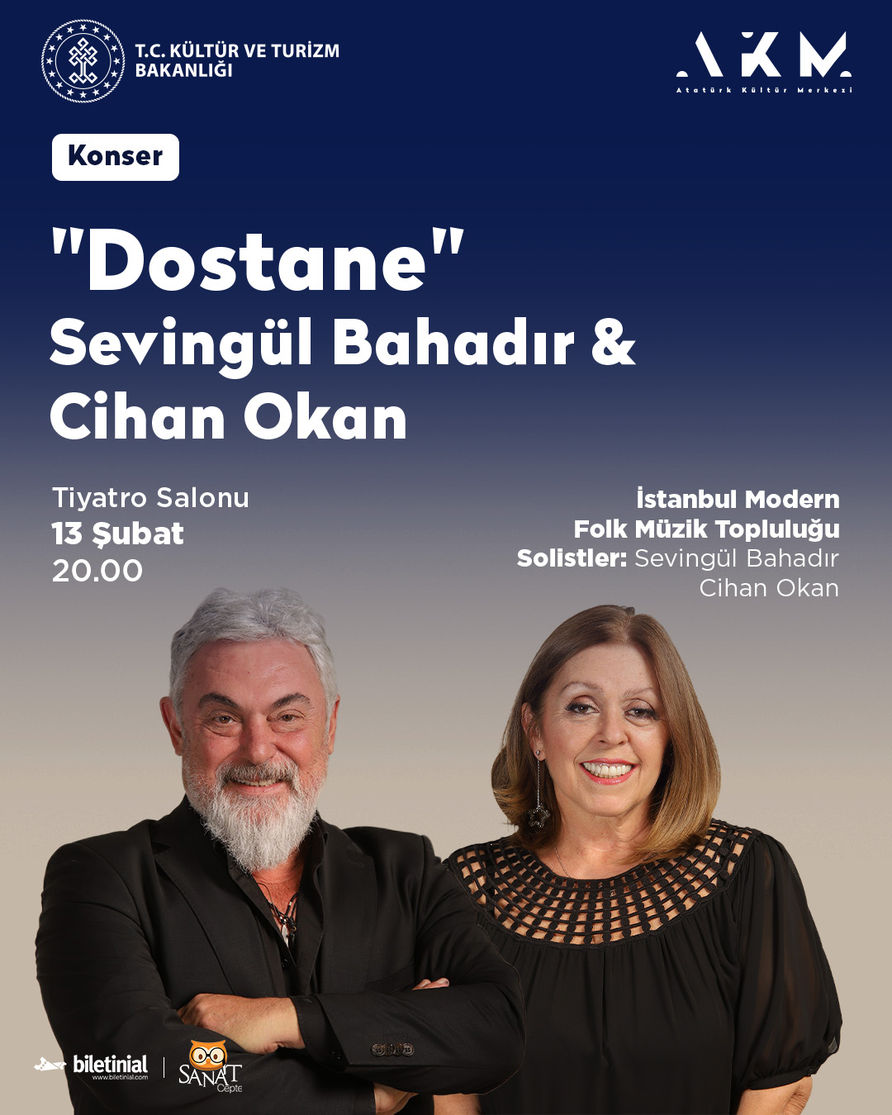 İstanbul Devlet Folk Müzik Topluluğunda 1993 yılından beri görev yapan değerli solistler, Sevingül Bahadır ve Cihan Okan’ın ‘Dostane’ konseri 13 Şubat Salı günü saat 20.00’de AKM Tiyatro Salonunda müzikseverler ile buluşuyor.