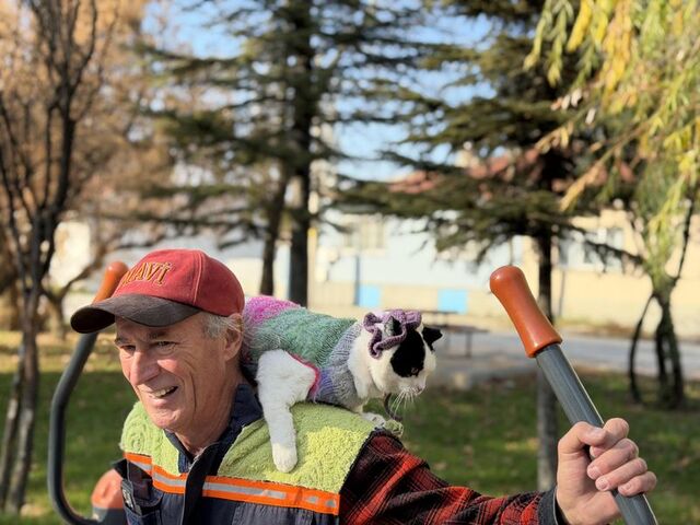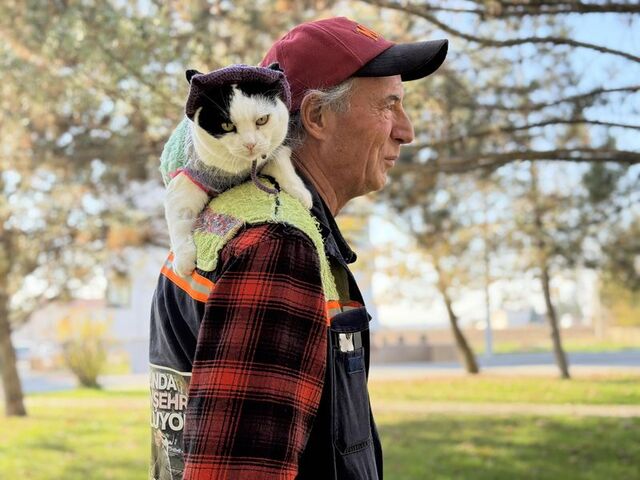 Eskişehir'de 12 yıl önce sokaktan sahiplenerek 'Sylvia' adını verdiği kedisini omzunda taşıyan 65 yaşındaki Mustafa Rahmi Erçetin, görenlerin ilgisini çekiyor. Özel bir bağ kurduğu kedisiyle bisiklete binip, spor yapan, kafe, restoran ve parklara da gittiklerini söyleyen Erçetin, "Kedimle 65 şehir gezdik, en büyük dileğim Sylvia ile Selanik'e gitmek" dedi.