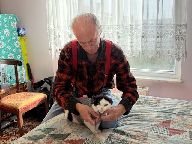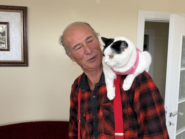 Kedisi Sylvia’yı bir an bile yanından ayırmayan Mustafa Rahmi Erçetin, “12 yıl önce Bursa’nın Bademli köyünde bahçede oturuyordum, karşımda sağlık ocağı vardı. Balkonda otururken ufacık kedi gördüm. Avucum kadar bir şeydi. Sağlık ocağının kapısına geldi, geri döndü. İçim sızladı. Yakaladım ve eve getirdim. Şu an 12 yılın içindeyiz, 12 yıldır benimle. İnsanların çok dikkat ettiği, şaşırdığı imrendiği olay şu. ‘Ağabey, Sylvia’yı nasıl alıştırdın? Nasıl omzunda geziyor? Nasıl eğittin’ soruları oluyor.