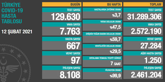12 Şubat Türkiye Günlük Koronavirüs Tablosu tarafından dün yayınlandı. İşte resmi veriler;
