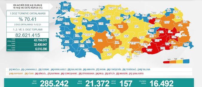 En az bir doz aşı yapılanların oranı en az iller ise Şanlıurfa, Mardin, Bitlis, Muş, Diyarbakır, Gümüşhane, Batman, Bingöl, Iğdır ve Bayburt olarak sıralandı.