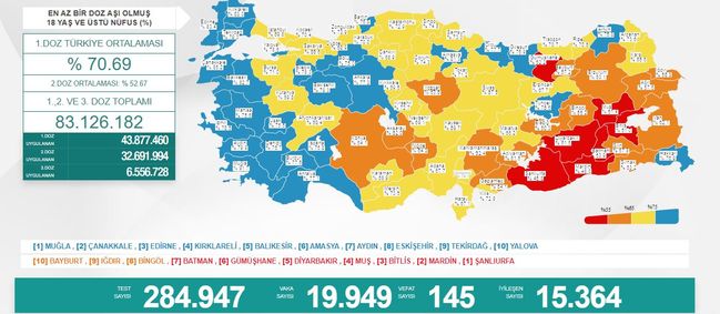 Buna göre, Türkiye'de son 24 saatte 284 bin 947 Kovid-19 testi yapıldı, 19 bin 949 kişinin testi pozitif çıktı, 145 kişi hayatını kaybetti, iyileşenlerin sayısı ise 15 bin 364 oldu.