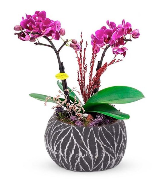 Osevio siyah taş saksıda çift dal mini mor orkide, 169 TL