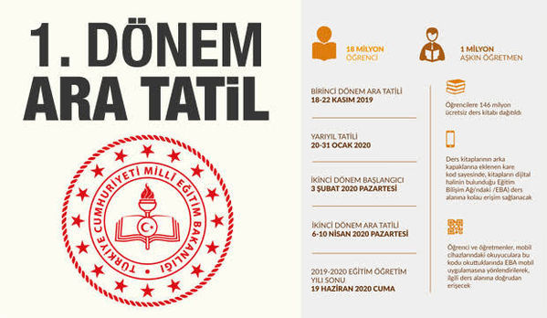 Milli Eğitim Bakanlığı (MEB) 2019 - 2020 resmi takvimine göre yeni eğitim ve öğretim yılı birinci dönemi 17 Ocak 2020 Cuma günü sona erecek. 13 Nisan'da başlayacak ikinci dönemin ikinci yarısı ise 19 Haziran'da tamamlanarak 11 haftalık yaz tatiline girilecek.