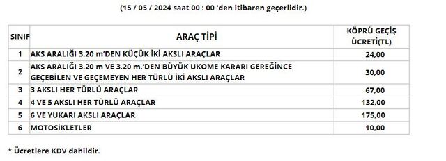15 Temmuz Şehitler Köprüsü geçiş ücreti zamlandı. 15 Mayıs'tan itibaren geçerli olan Karayolları Genel Müdürlüğü (KGM) ve Yap-İşlet-Devret (YİD) kapsamında özel şirketler tarafından işletilen otoyol ve köprülerin geçiş ücretleri yeniden düzenlenmiş oldu. İşte 15 Temmuz Şehitler Köprüsü güncel fiyat listesi 2024