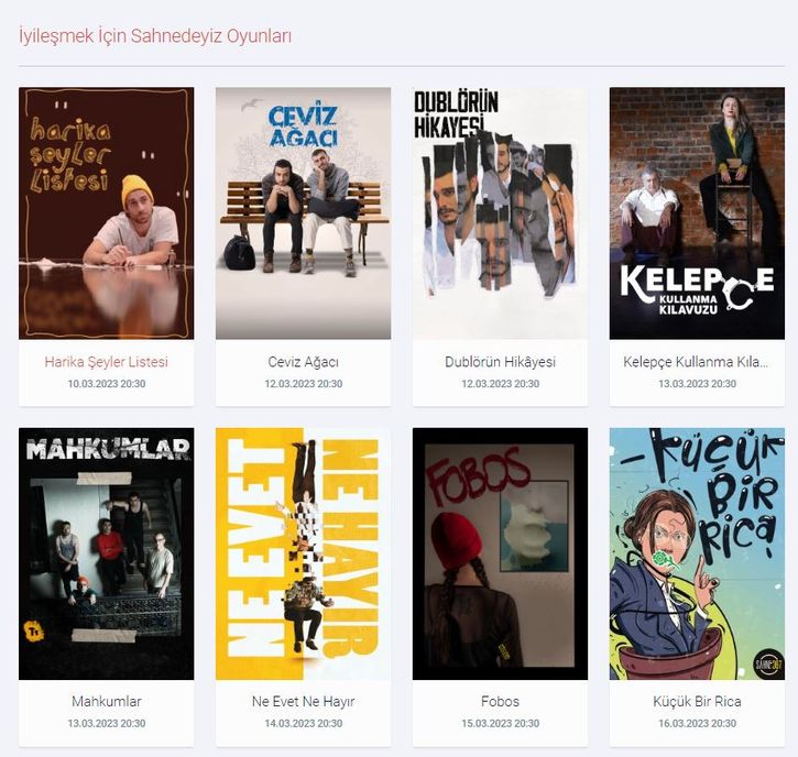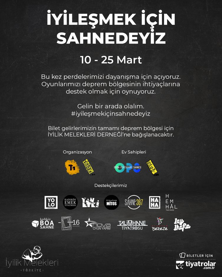 Arsız Kumpanya ve T1 Yapım Sanat öncülüğünde 16 tiyatro ekibi, 10-25 Mart tarihlerinde oyunlarını depremden etkilenenler için oynayacak. "İyileşmek İçin Sahnedeyiz" kampanyası kapsamında elde edilecek bilet geliri, tiyatrolar.com üzerinden depremin ilk gününden itibaren bölgede çalışan İyilik Melekleri Derneği'ne bağışlanacak.