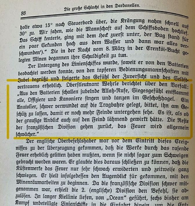 Lorey'in aktardığına göre; Yarbay Wehrle, Fransız devi Bouvet'nin saat 13.50 sularında isabet alarak sadece 3 dakika içerisinde Çanakkale'nin sularına gömülmesini tabyalardaki askerlerin gözünden şöyle rapor etmiştir: 'Bataryalardan neşeler yükseldi, Allah Allah nidaları ve zafer teraneleri göklere çıkıyordu. Topçular şarkı söylüyor ve oynuyorlardı' Savaşın en dehşetli anlarında yaşanan bu büyük sevinç, tabyalardaki vatanperverlik duygusunu zirveye taşımıştı' dedi.