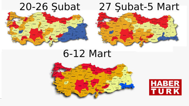 Sağlık Bakanlığı tarafından açıklanan 6-12 Mart haftalık vaka sayısı tablosuna göre ortaya yüksek riskli bir tablo çıktı. Marmara'nın neredeyse tamamı kırmızı olan haritada yine Karadeniz kıyıları Kastamonu'dan Artvin'e kadar yüksek riskli çıktı. Haritanın batısındaki tek mavi il Uşak da sarıya döndü. Doğu ve Güneydoğu'daki mavi iller de kaygı verici şekilde azaldı. İlk haritada neredeyse tamamı mavi olan bu bölgeden sadece Siirt, Şırnak ve Hakkari mavi çıktı.
