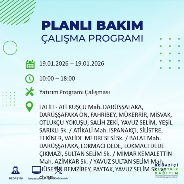 19 Ocak Pazartesi günü planlı elektrik kesintileri açıklandı. Boğaziçi Elektrik Dağıtım A.Ş. (BEDAŞ), bakım ve yatırım çalışmaları nedeniyle kent genelinde enerji kesintisi yapılacağını açıkladı. Şirketin planına göre, kesintiler birçok ilçede belirli saat aralıklarında etkili olacak. İşte ayrıntılar...