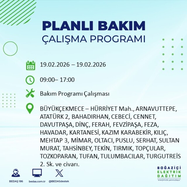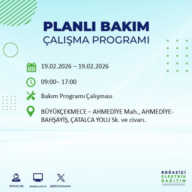 İstanbul Avrupa yakasında planlı elektrik kesintisi yaşanacak ilçelerin ve mahallelerin yer aldığı Planlı Elektrik Kesinti listesine, www.bedas.com.tr web sitesinde ana sayfada Planlı Kesintiler butonundan, mobil web sitesinden ve BEDAŞ 186 mobil uygulamasından ulaşabilirsiniz. Ayrıca Planlı Elektrik Kesintileri hakkında SMS bilgilendirilmesi almak için de BEDAŞ'a başvurabilirsiniz.