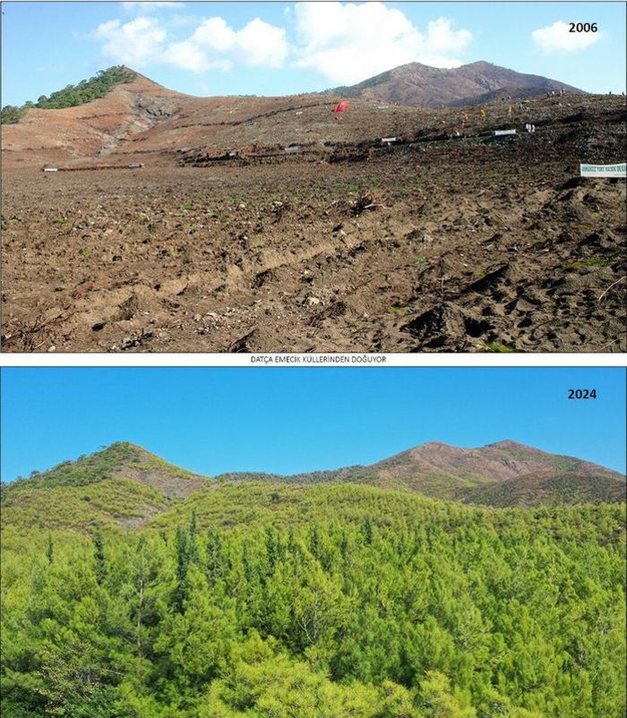 Emecik'te 19 yıl önce dikilen fidanlar ağaca, ağaçlar ormana dönüştü. Muğla Orman Bölge Müdürlüğü tarafından öncesi ve sonrası olarak paylaşılan fotoğraflarda alanın tamamen yeşile döndüğü görüldü.