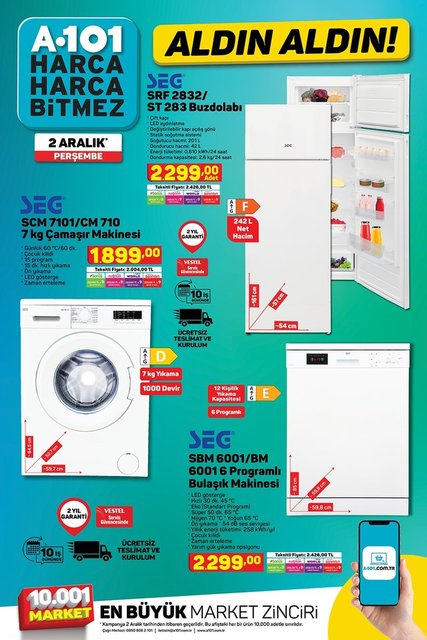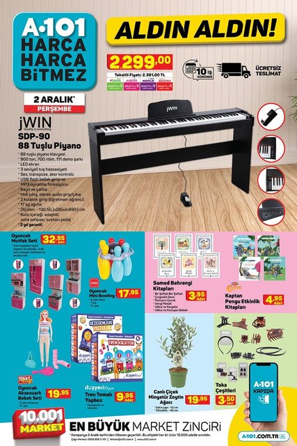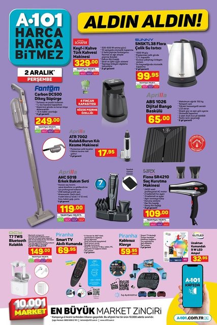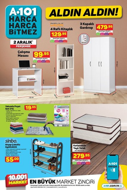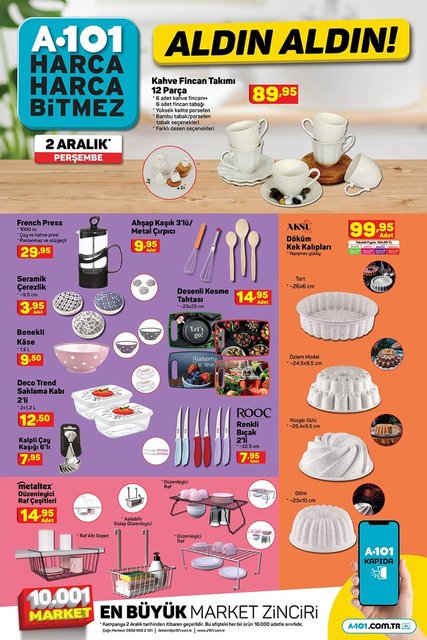 Alışveriş tutkunlarının gündeminde 2 Aralık A101 Aktüel Ürünler kataloğu var. Her hafta perşembe günler A101 marketlerde satışa sunulan indirimli fırsat ürünleri belli oldu. A101'de bu hafta buzdolabından çalışma masasına, katlanabilir yataktan tuşlu piyanoya, dijital banyo baskülünden raf düzenleyicilerine kadar pek çok ürün indirimli fiyatlarla raflarda olacak. 2 Aralık A101 Aldın Aldın fırsat ürünleri