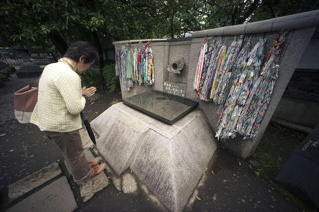 Fotoğrafta Mieko Mori, Tokyo'daki parkta atom bombası kurbanları için dikilen bir anıt olan Hiroşima ve Nagazaki Alevi'nin önünde dua ediyor. Kaynak: AP