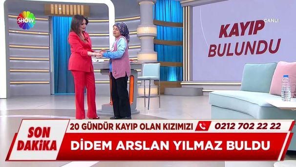 Show TV ekranlarında yayınlanan Didem Arslan Yılmaz'la Vazgeçme programında bugün, son dakika gelişmesi yaşandı. 20 gündür kayıp olan Gülistan'ın kızı Emine Eda'yı, Didem Arslan Yılmaz bulduğunu açıkladı.