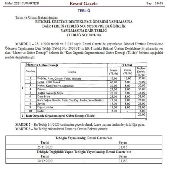 6 MART 2021 TARİHLİ RESMİ GAZETE'DE YAYIMLANAN YENİ MAZOT, GÜBRE DESTEĞİ FİYATLARI