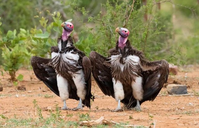 Güney Afrika, Mpumalanga'da tüm hünerlerini sergileyen sarkık yanaklı akbabalar.