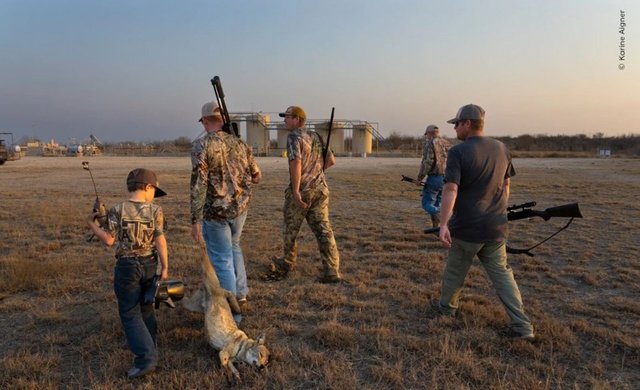 Karine Aigner (ABD) Teksas eyaletinde düzenlenen yıllık av yarışmalarını belgeledi. 24 saat süren yırtıcı hayvan avlama yarışmasında, avcı ekibin yakaladığı çakal gösteriliyor...