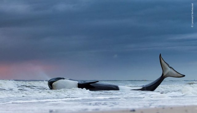 Kıyıya vurmuş bir orkanın son anları gösteriliyor.