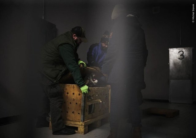 Polonyalı fotoğrafçı Poznan Hayvanat Bahçesi'nden bir ekibin tahliye ettiği kaplan yavrusunu kontrol etmek için verdiği mücadeleyi görüntülüyor.
