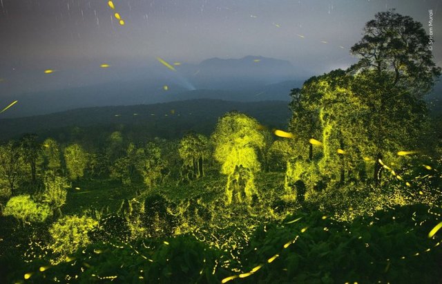 Ateşböcekleriyle aydınlatılmış orman ve gökyüzü.