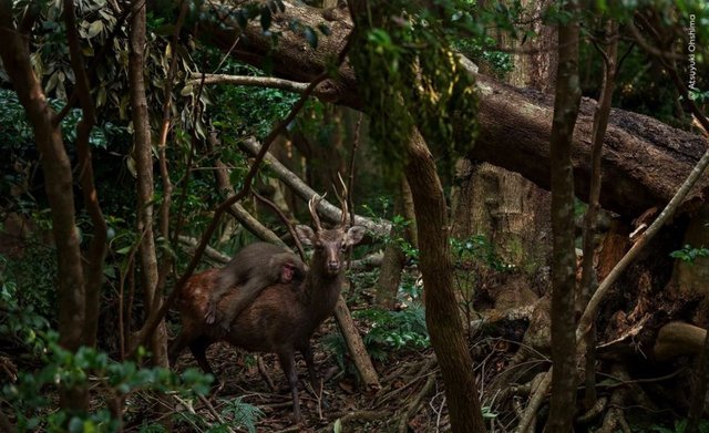 Bir makak maymunun, geyiğin üzerine atlaması gibi alışılmadık bir etkileşim fotoğraflanıyor.