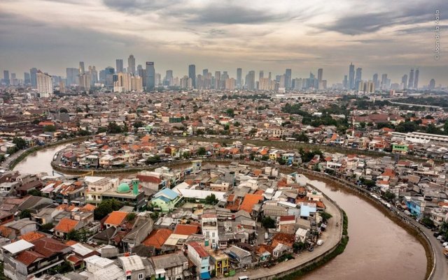 Endonezya'nın başkenti Jakarta'dan geçen kirli Ciliwung Nehri'nin kuşbakışı görüntüsü.