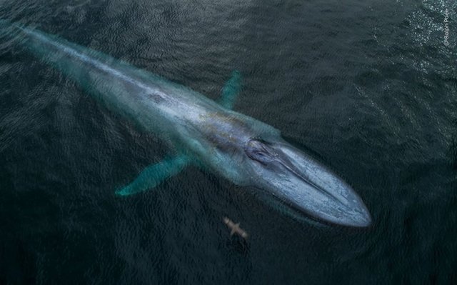 Mavi balina ve bir uçan fulmarın büyüklüğü karşılaştırılarak gözler önüne seriliyor.