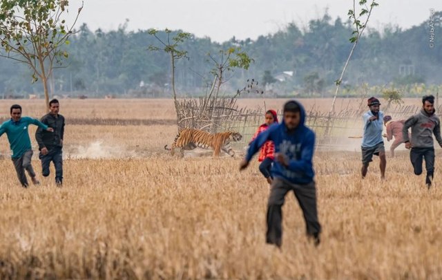 Hindistan'da bir tarım arazisinde kaplanın ortaya çıkmasıyla yaşanan kaos gösteriliyor.