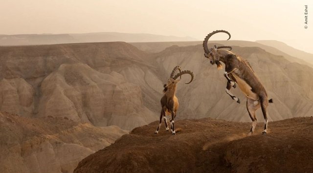 Uçurum kenarında iki Nubyalı dağ keçisinin çatışması.