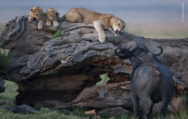 Fransalı fotoğrafçı Olivier Gonnet, bir aslanın yavrularını bufalodan korumak için verdiği mücadeleyi yakalıyor.