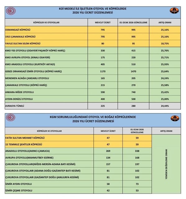 2026 yılında geçerli olmak üzere köprü ve otoyol ücretlerine zam geldi.