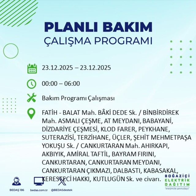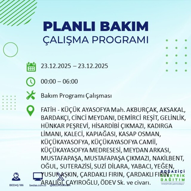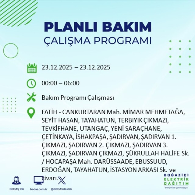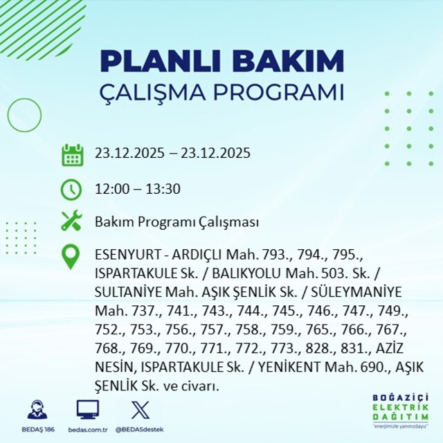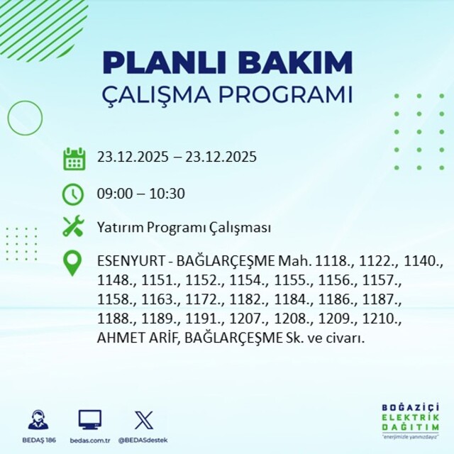 Boğaziçi Elektrik Dağıtım A.Ş (BEDAŞ) İstanbul'da 23 Aralık Salı günü çeşitli ilçelerde elektrik kesintisi yaşanacağını paylaştı. Kesinti yaşanacak ilçeler ve mahalle bilgileri de paylaşıldı. İstanbul Avrupa Yakası elektrik kesintisi duyuruları BEDAŞ tarafından günlük olarak yayınlanıyor. İşte İstanbul'da elektrik kesintisi detayları...