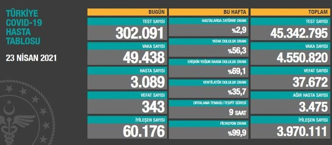 Türkiye Günlük Koronavirüs Tablosu, "covid19.saglik.gov.tr" adresinden paylaşıldı. Türkiyede son 24 saatte 302 bin 91 Kovid-19 testi yapıldı, 49 bin 438 kişinin testi pozitif çıktı, 343 kişi hayatını kaybetti. Peki 24 Nisan Koronavirüs tablosu yayınlandı mı? İşte koronavirüs son durumu...