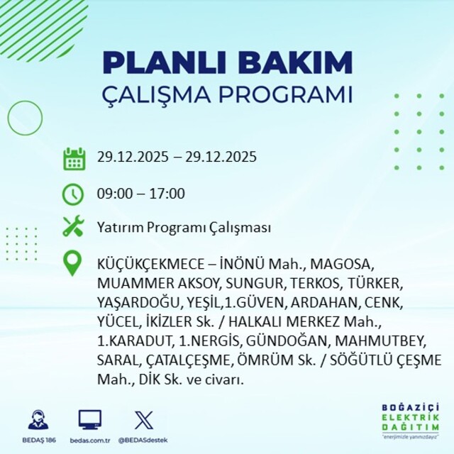 29 Aralık Pazartesi günü planlı elektrik kesintileri açıklandı. Boğaziçi Elektrik Dağıtım A.Ş. (BEDAŞ), bakım ve yatırım çalışmaları nedeniyle kent genelinde enerji kesintisi yapılacağını açıkladı. Şirketin planına göre, kesintiler birçok ilçede belirli saat aralıklarında etkili olacak. İşte ayrıntılar...