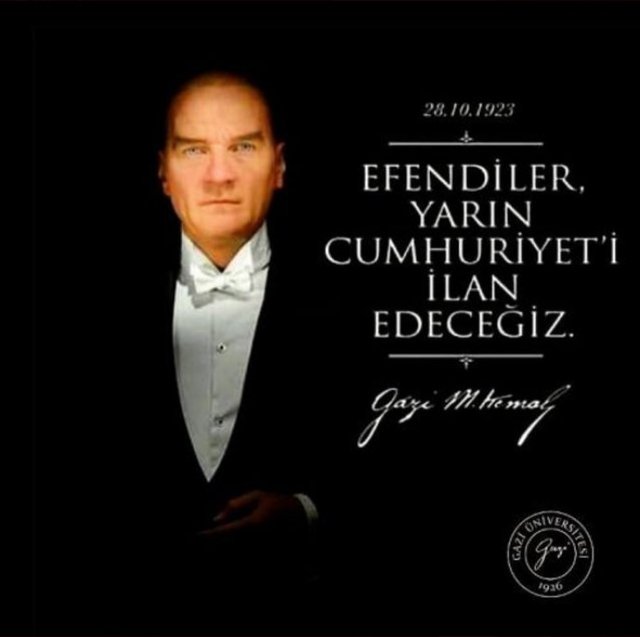 Atatürk'ün önderliğinde büyük Türk Milleti'nin kanı, canı ve sonsuz emekleriyle kurulan Cumhuriyetimizi, tüm değerleriyle sonsuza kadar yaşatmak hepimizin vazgeçilmez ortak sorumluluğudur. 29 Ekim Cumhuriyet Bayramınız Kutlu Olsun…