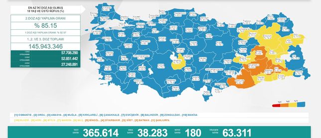 Sağlık Bakanlığı'nın açıkladığı 'Günlük Kovid- 19 Tablosu' verilerine göre; son 24 saatte yapılan 365 bin 614 testte 38 bin 283 vaka tespit edildi. Koronavirüs nedeniyle 180 kişi hayatını kaybederken, 63 bin 311 kişinin de tedavisi ve karantinası sona erdi. 18 yaş ve üzeri nüfusun aşılanması verilerinde 1'inci doz Türkiye ortalaması yüzde 92,97, 2'nci doz ortalaması yüzde 85,15 olarak ölçüldü. Ayrıca, 1'inci dozda 57 milyon 708 bin 290, 2'nci dozda 52 milyon 851 bin 442 ve 3'üncü dozda 27 milyon 248 bin 891 olmak üzere toplam 145 milyon 943 bin 346 aşı uygulandı.