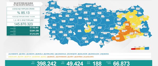 En az 2 doz aşı olan kişi sayısının en yüksek olduğu iller; Osmaniye, Ordu, Amasya, Muğla, Kırklareli, Çanakkale, Eskişehir, Balıkesir, Zonguldak ve Manisa olurken, 2 doz aşı yapılan kişi sayısının en düşük olduğu iller ise Şanlıurfa, Batman, Siirt, Diyarbakır, Bingöl, Muş, Mardin, Bitlis, Ağrı ve Elazığ oldu.