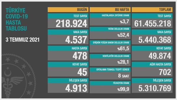 3 Temmuz Türkiye Günlük Koronavirüs Tablosu tarafından dün yayınlandı. İşte resmi veriler;