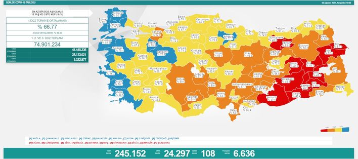 5 Ağustos koronavirüs tablosunun açıklandı. En güncel koronavirüs tablosuna göre; Türkiye'de son 24 saatte 245 bin 152 Kovid-19 testi yapıldı, 24 bin 297 kişinin testi pozitif çıktı, 108 kişi hayatını kaybetti. İşte en güncel koronavirüs haberleri...