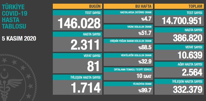 Sağlık Bakanlığı 5 Kasım koronavirüs tablosunu yayınladı. Sağlık Bakanı Koca: "Bugün tespit edilen 2311 yeni hastamız var. Ağır hasta sayımız dünden 100 fazla. Bu artışa engel olmak zorundayız." dedi. Bugünkü korona virüs tablosu ve vaka sayısı haberimizde yer alıyor. İşte son dakika corona virüs haberleri...