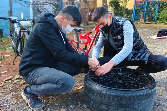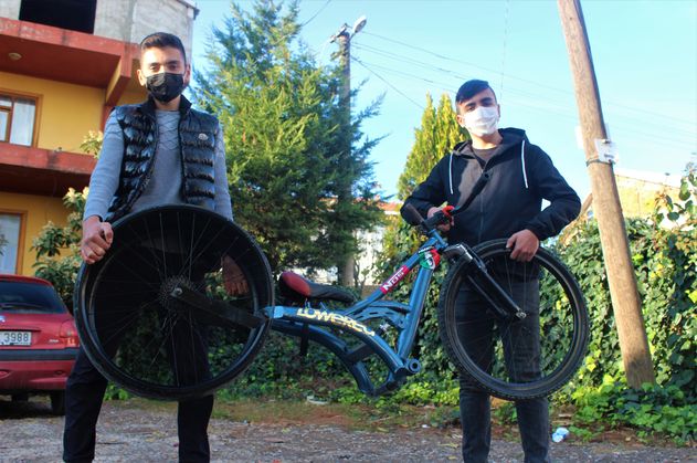 Kocaeli'nin Gebze ilçesinde yaşayan 16 yaşındaki 2 arkadaşın, pandemi döneminde can sıkıntısıyla hayata geçirdikleri ve hurda demirleri kullanarak yaptıkları araba lastikli bisiklet, vatandaşlardan yoğun talep gördü