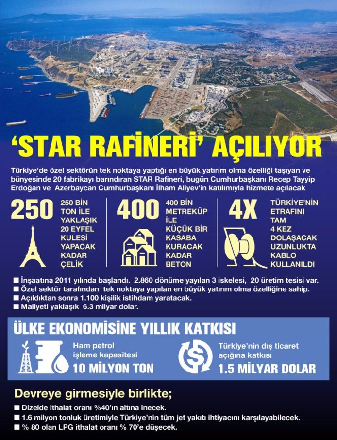 Türkiye'nin yeni yıldızı STAR Rafineri'nin açılışını Cumhurbaşkanı Recep Tayyip Erdoğan ve Azerbaycan Cumhurbaşkanı İlham Aliyev yapacak. Türkiye’nin işlenmiş petrol ürünü ihtiyacının yüzde 25’ini tek başına karşılayacak olan STAR Rafineri, aynı zamanda Türkiye’nin ilk Stratejik Teşvik Belgesini alan yatırım. Azerbaycan devlet petrol şirketi SOCAR'ın iştiraki olarak faaliyete geçecek olan STAR, iki ülkenin ekonomik ve siyasi ilişkilerini daha da geliştirecek kilometre taşlarından birisi olacak.