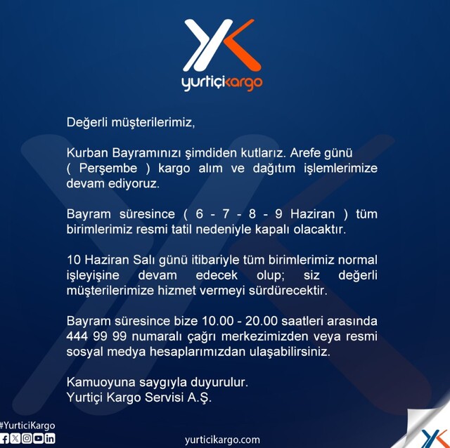 "Değerli müşterilerimiz, Kurban Bayramınızı şimdiden kutlarız. Arefe günü (Perşembe) kargo alım ve dağıtım işlemlerimize devam ediyoruz. Bayram süresince (6 - 7 - 8 - 9 Haziran) tüm birimlerimiz resmi tatil nedeniyle kapalı olacaktır.